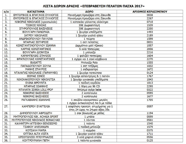 Χθες Τρίτη 18 Απριλίου 2017 και ώρα 21:30 διεξήχθη η κλήρωση της δράσης ΕΠΙΒΡΑΒΕΥΣΗ ΠΕΛΑΤΩΝ του Εμπορικού Συλλόγου Δύμης.