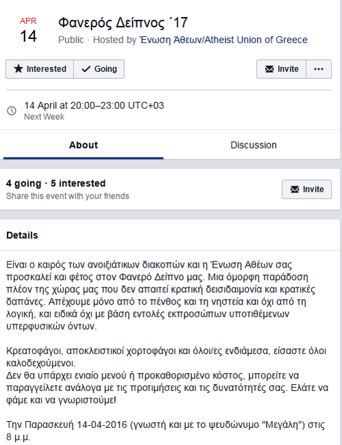 Είναι τόσο μεγάλο το μένος της Ένωσης Aθέων εναντίον των Χριστιανών και της Ορθοδοξίας και βιάζονται τόσο πολύ να λοιδωρήσουν τη θρησκεία μας που (προφανώς) έκαναν copy paste το κείμενο από το περσινό δείπνο της ντροπής που διοργάνωσαν αλλάζοντας μόνο τον τίτλο. Έτσι ενώ καλούν τους ακολούθους τους σε «γλέντι» την Μεγάλη Παρασκευή 14/4 ως ημερομηνία βάζουν το 2016.