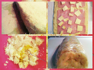 Απλώνουμε πάνω στην ζύμη μας, το ζαμπόν και το κασέρι.