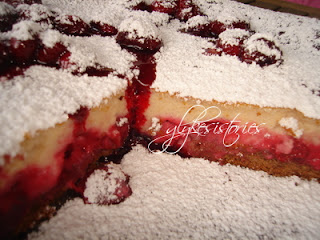 Σε ένα άλλο μπολ ανακατεύουμε καλά όλα τα υλικά για την κρέμα μας , εκτός από το αλεύρι στο οποίο έχουμε ανακατέψει τα κεράσια και το προσθέτουμε σιγά σιγά στο τέλος στο μείγμα κρέμας τυριού.