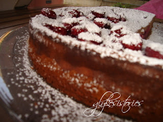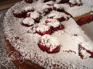 Μόλις το κέικ μας βγει από το φούρνο , περιχύνουμε με το σιρόπι και τα κεράσια , πασπαλίζουμε με άχνη ζάχαρη και αφήνουμε να κρυώσει. Βάζουμε στο ψυγείο για τουλάχιστον 1 ώρα και σερβίρουμε.