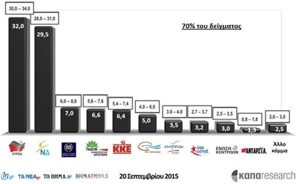 Σύμφωνα με το Exit poll της Κάπα Research ο ΣΥΡΙΖΑ προηγείται με (30-34%) της ΝΔ (28-31%).