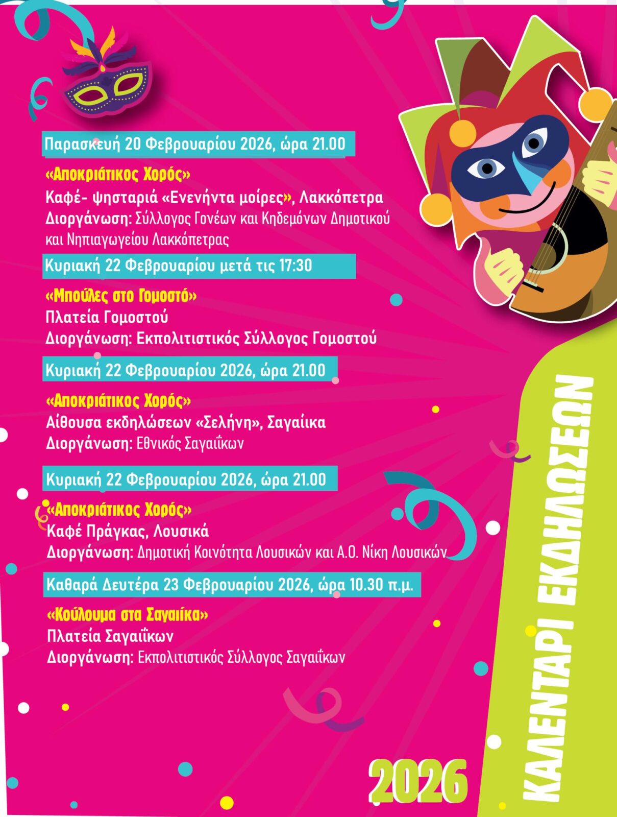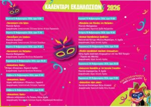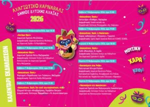 Το καλεντάρι του Αχαγιώτικου Καρναβαλιού 2026 πιο πλούσιο από ποτέ περιλαμβάνει όλες τις εκδηλώσεις, δράσεις και δρώμενα που θα πραγματοποιηθούν σχεδόν σε όλες τις Δημοτικές Κοινότητες, από πολιτιστικούς συλλόγους, συλλόγους γονέων και κηδεμόνων, φορείς, αθλητικές ομάδες, κι άλλους.