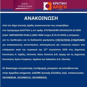 Αναρτήθηκε σήμερα η απόφαση για τους όρους, τις προϋποθέσεις και τη διαδικασία χορήγησης επιδότησης προσωρινής στέγασης με τη μορφή επιδότησης ενοικίου για την προσωρινή στέγαση των πληγέντων από τις πρόσφατες πυρκαγιές.
