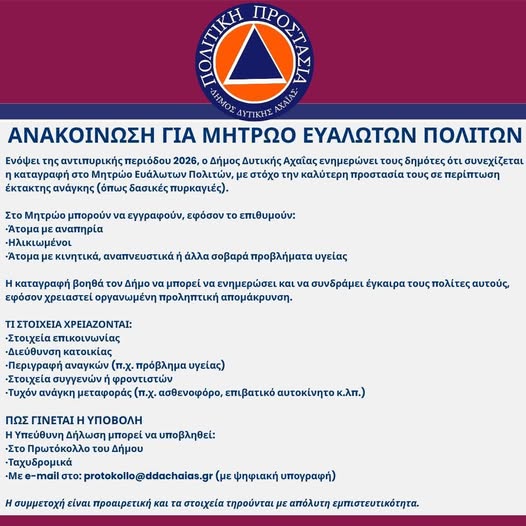 • Δυτική Αχαΐα – Μητρώο Ευάλωτων Πολιτών: Ενημερωθείτε για την καταγραφή από τον Δήμο
