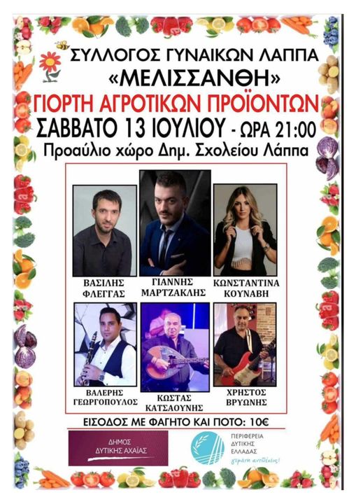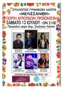 Μια γευστική μουσική βραδιά ετοιμάζει ο Σύλλογος Γυναικών ΜΕΛΙΣΣΑΝΘΗ, τη Γιορτή Αγροτικών Προϊόντων, το Σάββατο 13 Ιουλίου στο Δημοτικό Σχολείο Λάππα στις 9 το βράδυ.