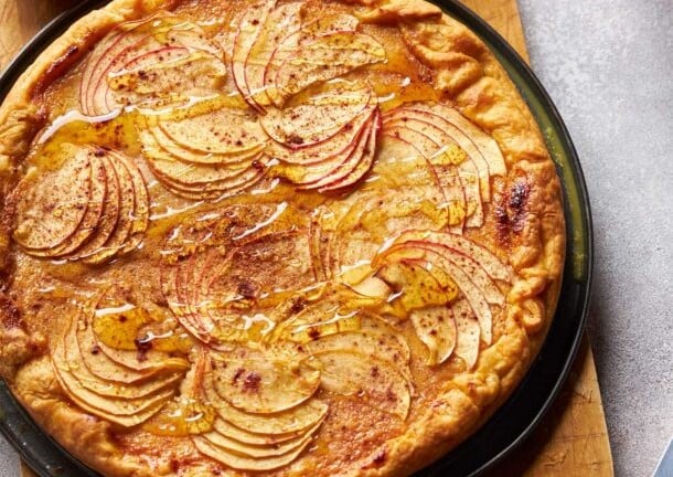 4. Ξεφουρνίζουμε και απλώνουμε στην επιφάνεια σαν βεντάλια τις φέτες μήλου.