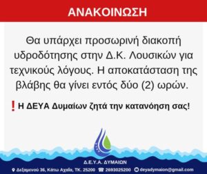 Λίγο περισσότερο από “δύο ώρες” χρειάστηκε να αποκατασταθεί η βλάβη στον αγωγό ύδρευσης που είχε αφήσει τα Λουσικά χωρίς νερό.