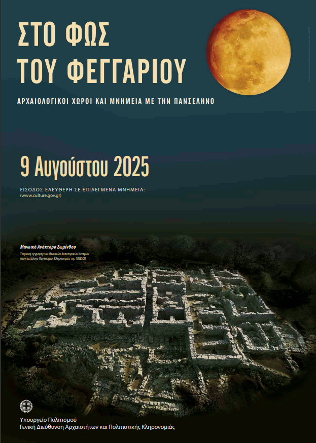 Το Υπουργείο Πολιτισμού διοργανώνει και φέτος τις εκδηλώσεις της Αυγουστιάτικης Πανσελήνου, υπό τον συντονισμό της Γενικής Διεύθυνσης Αρχαιοτήτων και Πολιτιστικής Κληρονομιάς, προσφέροντας ελεύθερη είσοδο σε επιλεγμένους αρχαιολογικούς χώρους, τη νύχτα της Πανσελήνου, το Σάββατο 9 Αυγούστου 2025.