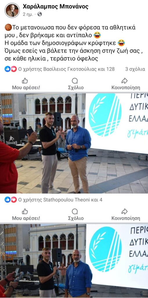 Φυσικά και χαριτολογούσε ο αν. Περιφερειάρης Δυτικής Ελλάδας Χαράλαμπος Μπονάνος δημοσιεύοντας το συγκεκριμένο ποστ, για να επαναλάβει την αξία που έχει η άσκηση στον οργανισμό.