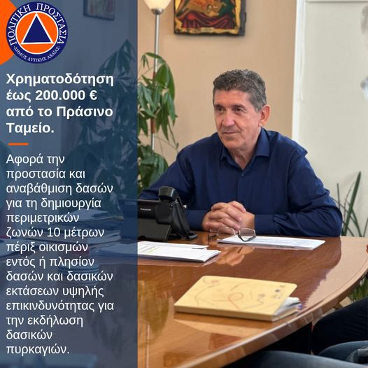Συγκεκριμένα, η χρηματοδότηση αφορά την προστασία και αναβάθμιση δασών για τη δημιουργία περιμετρικών ζωνών 10 μέτρων πέριξ οικισμών εντός ή πλησίον δασών και δασικών εκτάσεων υψηλής επικινδυνότητας για την εκδήλωση δασικών πυρκαγιών.