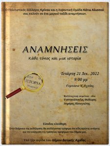 Ο Πολιτιστικός Σύλλογος Κρίνου, η Χορευτική Ομάδα Κάτω Αλισσού και η Κοινωφελής επιχείρηση του Δήμου Δυτικής Αχαΐας σας καλούν σε ένα μαγικό ταξίδι αναμνήσεων.Με αγαπημένα τραγούδια και χορούς οι θύμησες θα πάρουν ζωή επί σκηνής.