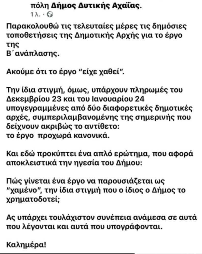 Αίσθηση προκάλεσε απο το Δημοτικό Συμβούλιο η «απώλεια» έργων 4,69 εκατ. ευρώ από την προηγούμενη Δημοτική Αρχή του Δήμου Δυτικής Αχαΐας. Μάλιστα, δημιουργήθηκε και σχετικός θόρυβος από πρώην υποψήφιο της τότε παράταξης Μυλωνά (μη εκλεγμένο) και όπως φαίνεται υποψήφιο δήμαρχο που με αναρτήσεις του στα μέσα κοινωνικής δικτύωσης προσπάθησε να πείσει ότι όλα έγιναν καλώς και δεν υπήρχε κανένα πρόβλημα από τους προηγούμενους…