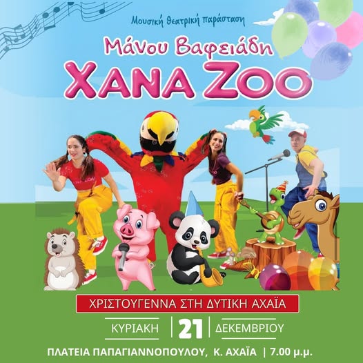 Μία μοναδική θεατρική παράσταση με τους αγαπημένους των μικρών Xana Zoo θα πραγματοποιηθεί την Κυριακή 21 Δεκεμβρίου, στις 7 μ.μ. στην πλατεία Παπαγιαννοπούλου, στην Κ. Αχαΐα στο πλαίσιο των χριστουγεννιάτικων εκδηλώσεων που διοργανώνει ο Δήμος Δυτικής Αχαΐας.